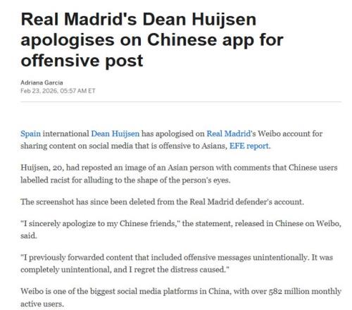 此外,西班牙COPE電臺、《阿斯報》、《世界體育報》等媒體,也都關(guān)注赫伊森辱華事件,沙特媒體OKAZ也跟進報道。不過,皇馬官方、赫伊森本人,都沒有在全球平臺發(fā)聲道歉。