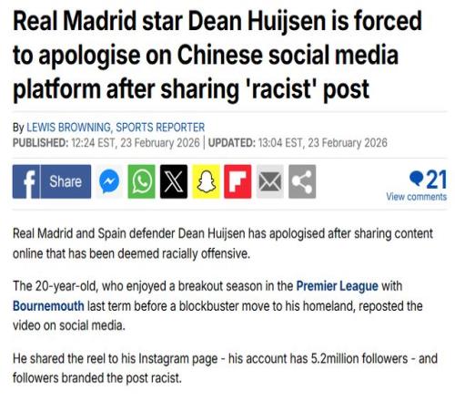 “瞇瞇眼”是西方文化中,具有種族歧視含義的標(biāo)志性動作。種族歧視是不可觸碰的紅線,皇馬致力于反種族歧視,但赫伊森親自下場搞種族歧視。24小時之內(nèi),全球媒體紛紛報道此事。