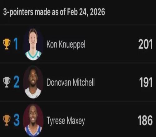 這哥們的確變態(tài)準(zhǔn),而且他只要再扔進6記三分球達(dá)到207記,就可以登頂NBA史上新秀三分王,22屆首輪第四號秀基根-默里(國王)曾于22-23賽季出戰(zhàn)80場比賽合計扔進206記三分球。