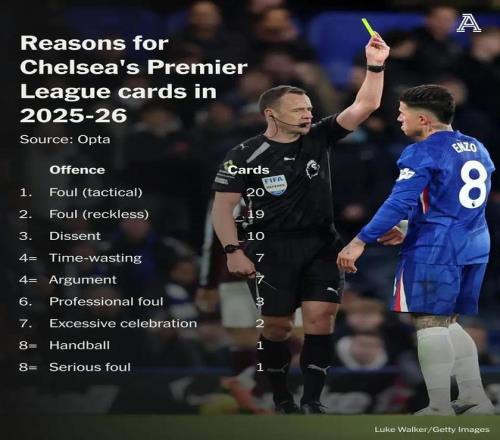切爾西本賽季英超吃牌原因排行:戰(zhàn)術(shù)犯規(guī)20張,表達異議10張