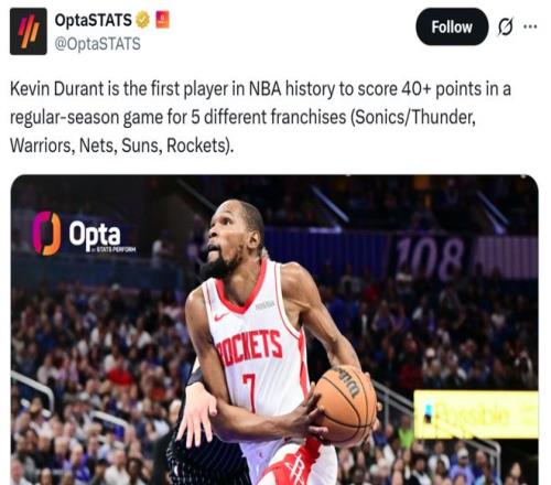 37歲151天的杜蘭特轟下40+得分也讓其成為火箭隊(duì)史單場砍下40+最老的球員,同時這是其火箭生涯第一次40+,讓杜蘭特成為NBA歷史上首位在5支不同球隊(duì)常規(guī)賽都拿到過40+得分的球員。