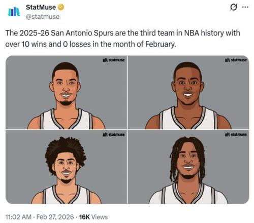 11連勝不僅是現(xiàn)存最長連勝,也是馬刺隊時隔10年再次拿到11連勝,這讓馬刺保持2月份至今保持不敗金身,隊史第三次單月做到至少10勝0負,也是NBA歷史上第三支在2月份做到這一點的球隊。