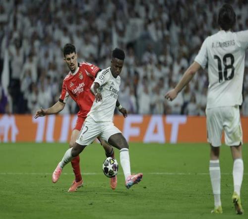 2月25日,皇家馬德里隊(duì)球員維尼修斯與本菲卡隊(duì)球員里奧斯(左)拼搶。新華社