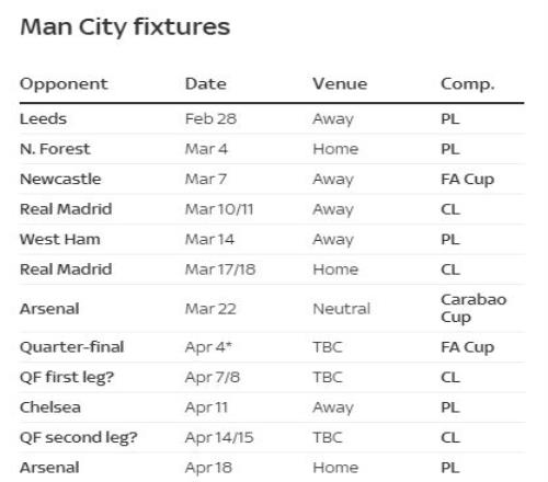 3月7日,曼城將客場對陣紐卡斯?fàn)枺S后將在3月10日或11日做客伯納烏。3月14日,曼城客場對陣西漢姆。3月17日或18日,曼城將在主場對陣皇馬。3月22日,曼城將在聯(lián)賽杯決賽里對陣阿森納。