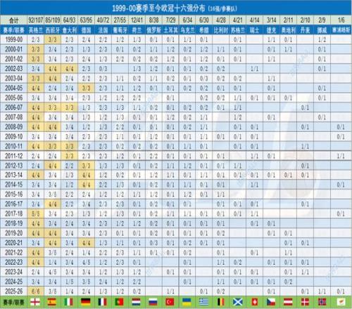 4、金黃色標(biāo)注的數(shù)據(jù),表示一國出征歐冠小組賽(聯(lián)賽)球隊數(shù)量不低于3支,且全部晉級十六強(qiáng)的情況。