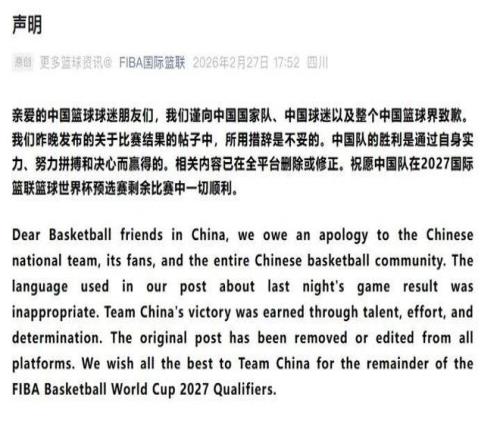 FIBA官方發(fā)表聲明,向中國(guó)男籃致歉......