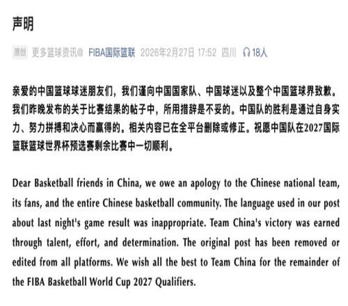 親愛(ài)的中國(guó)籃球球迷朋友們,我們謹(jǐn)向中國(guó)國(guó)家隊(duì)、中國(guó)球迷以及整個(gè)中國(guó)籃球界致歉。我們昨晚發(fā)布的關(guān)于比賽結(jié)果的帖子中,所用措辭是不妥的。中國(guó)隊(duì)的勝利是通過(guò)自身實(shí)力、努力拼搏和決心而贏得的。相關(guān)內(nèi)容已在全平臺(tái)刪除或修正。祝愿中國(guó)隊(duì)在2027國(guó)際籃聯(lián)籃球世界杯預(yù)選賽剩余比賽中一切順利。