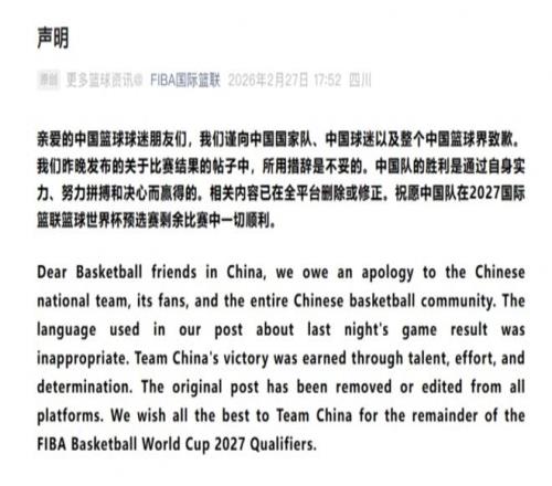 就在2月27日晚上7點(diǎn),F(xiàn)IBA國(guó)際籃聯(lián)官方發(fā)布了一則聲明,強(qiáng)調(diào)因昨日中國(guó)男籃戰(zhàn)勝日本男籃的比賽結(jié)果帖子中的措辭不當(dāng),向中國(guó)男籃、中國(guó)球迷以及整個(gè)中國(guó)籃球界致歉。