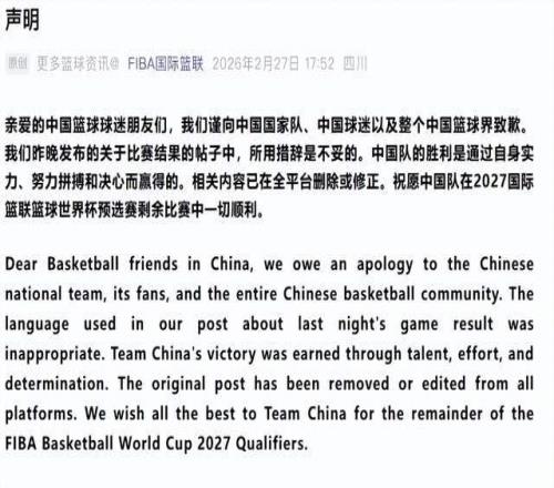 在比賽結(jié)束后的第二天,F(xiàn)IBA官方終于還是頂不住壓力了,官方發(fā)布聲明表示,因昨日中國男籃戰(zhàn)勝日本男籃的比賽結(jié)果帖子中的措辭不當(dāng),向中國男籃、中國球迷以及整個中國籃球界致歉。FIBA國際籃聯(lián)聲明內(nèi)容如下:親愛的中國籃球球迷朋友們,我們謹向中國國家隊、中國球迷以及整個中國籃球界致歉。我們昨晚發(fā)布的關(guān)于比賽結(jié)果的帖子中,所用措辭是不妥的。中國隊的勝利是通過自身實力、努力拼搏和決心而贏得的。相關(guān)內(nèi)容已在全平臺刪除或修正。祝愿中國隊在2027國際籃聯(lián)籃球世界杯預(yù)選賽剩余比賽中一切順利。