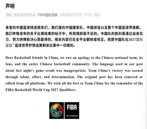2月26日中國男籃在沖繩客場87比80逆轉日本隊后,F(xiàn)IBA籃球世界杯官方社媒賬號在戰(zhàn)報里寫下“China with a sneaky win over Japan”(“sneaky”在英語里帶著“鬼鬼祟祟、不光彩”的暗示,多家媒體譯作“偷走一場勝利”),隨即引發(fā)輿情。相關帖文隨后被刪除;2月27日,F(xiàn)IBA在其官方微信發(fā)布中英雙語致歉,明確向中國國家隊、中國球迷以及中國籃球界致歉,承認措辭不妥,并強調中國隊勝利來自實力、拼搏與決心。