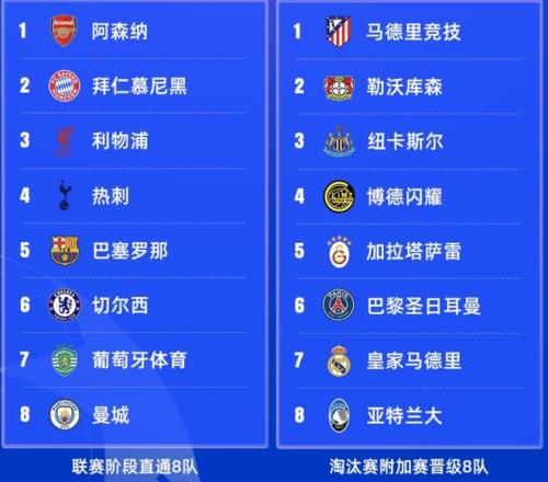 本屆大賽包括了之前直通的8隊,及附加賽晉級的8隊,分別是阿森納、拜仁、利物浦、熱刺、巴塞羅那、切爾西、葡萄牙體育、曼城(直通,按名次排列),及皇馬、巴黎、紐卡、馬競、亞特蘭大、勒沃庫森、加拉塔薩雷、博德閃耀(按小組賽的名詞排列)。
