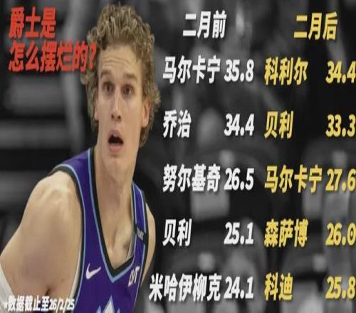 2月份前,爵士出場(chǎng)時(shí)間最多的人是——馬爾卡寧、豬豬俠喬治、努爾基奇、貝利、米哈伊柳克。