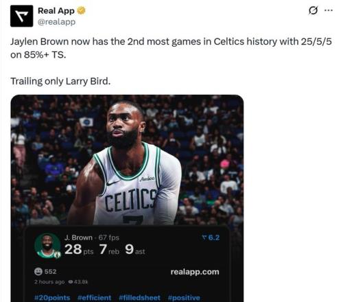 這是杰倫布朗生涯第4次單場以85%+的真實命中率拿下至少25分5板5助,成功追平隊史名宿皮爾斯并列綠軍隊史第二,僅次于拉里伯德的5次。