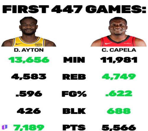 有球迷曬出了兩人生涯前447場比賽的總數(shù)據(jù)對比,艾頓上場時間(13656分鐘)和得分(7189分)高于卡佩拉,但籃板、投籃命中率和蓋帽都明顯低于對方。