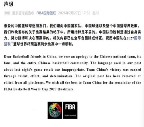 在輿論壓力持續(xù)升溫后,2月27日,國(guó)際籃聯(lián)通過(guò)其中文微信公眾號(hào)發(fā)布正式致歉聲明。