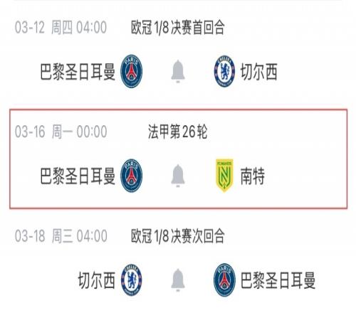 巴黎vs南特的法甲比賽延期后,巴黎3月對陣切爾西的兩回合歐冠1/8決賽之間將沒有其他比賽,球隊可以避免一周雙賽。