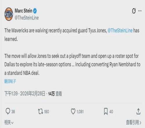 北京時(shí)間2月28日,據(jù)NBA名記Shams報(bào)道,太陽正式裁掉了后衛(wèi)科爾-安東尼。由于科爾-安東尼在3月1日之前被裁,他有資格代表新球隊(duì)出戰(zhàn)季后賽。但是截至目前,還沒有球隊(duì)表達(dá)興趣。同樣是今天,獨(dú)行俠裁掉了泰厄斯-瓊斯。