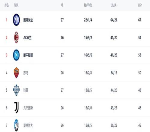 在積分榜上,國際米蘭以絕對(duì)優(yōu)勢(shì)占據(jù)榜首位置。國際米蘭22勝1平4負(fù),拿到67分。而排名第2的AC米蘭只拿到54分,足足落后國際米蘭13分。這樣的差距太驚人了。顯然,國際米蘭已經(jīng)無限接近冠軍了。那不勒斯贏球之后,總積分達(dá)到53分,排名第3。第4的是羅馬,拿到50分??颇A球之后,總積分達(dá)到48分,超越了尤文圖斯,升到第5名。而只拿到46分的尤文圖斯掉到第6名。