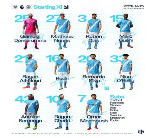 曼城首發(fā):25-多納魯馬、21-努里、15-格伊、3-魯本-迪亞斯、27-努內斯、16-羅德里、33-奧賴利、20-席爾瓦、10-謝爾基、7-馬爾穆什、42-塞門約