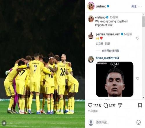 在比賽中錯失點球的C羅在第81分鐘被換下,有媒體拍到他在替補(bǔ)席接受冰敷治療。C羅在賽后更新了社交媒體寫道:“我們攜手共進(jìn),這是一場非常重要的勝利?!?/p>