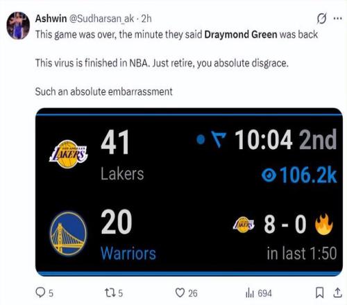 北京時間3月1日,金州勇士隊101-129慘敗洛杉磯湖人隊。這場比賽勇士隊一度落后湖人隊32分之多,勇士隊在主場輸?shù)铰椤5吕酌傻?格林復出球隊就輸球讓很多勇士媒體破防了,追夢在場-30球隊最差。