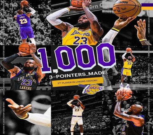 值得一提的是,詹姆斯在此役還創(chuàng)下了3大神跡。第1、此役之后,詹姆斯命中了加盟湖人后的第1000+記三分,成為隊史第二位達成此成就的湖人球員,第一位是科比(1827記)。