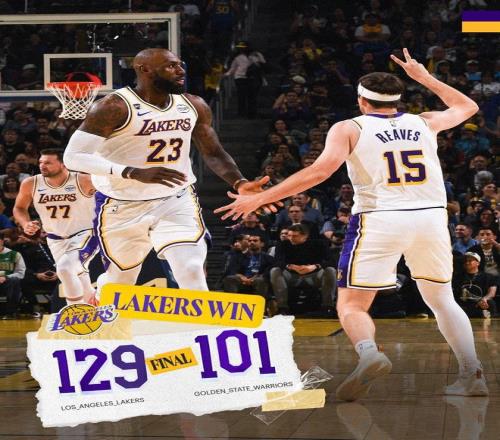 科爾請求暫停,距離終場還剩7分45秒,兩隊都換上了大部分板凳席末端的球員,雙方開始在場上練兵,比賽時間逐漸走完。最終,湖人以129比101完勝勇士,就此止住了3連敗。