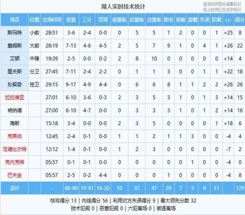 湖人隊:東契奇26分6板8助、詹姆斯22分7板9助、里夫斯18分1板3助、肯納德16分3板3助、拉拉維亞15分5板3助、斯瑪特8分5板1助2斷、巴夫金8分1助、海斯6分5板、艾頓4分10板