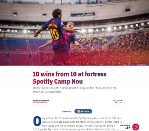 新諾坎普球場是巴薩的福地,巴薩官方統(tǒng)計本賽季回歸之后,球隊打出的主場10連勝: