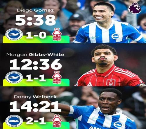 在比賽中,迭戈-戈麥斯在5分38秒為布萊頓首開紀錄,吉布斯-懷特在12分36秒為森林扳平比分,而維爾貝克在14分21秒幫助布萊頓再次領先。據英超官方統(tǒng)計,這是本賽季英超首次出現(xiàn)前15分鐘打入3球的情況。