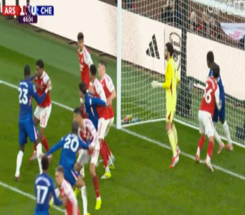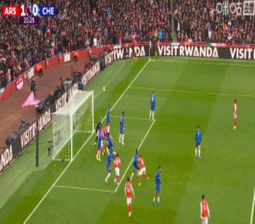 第21分鐘,薩利巴利用角球機(jī)會(huì)頭球破門,阿森納1-0切爾西!