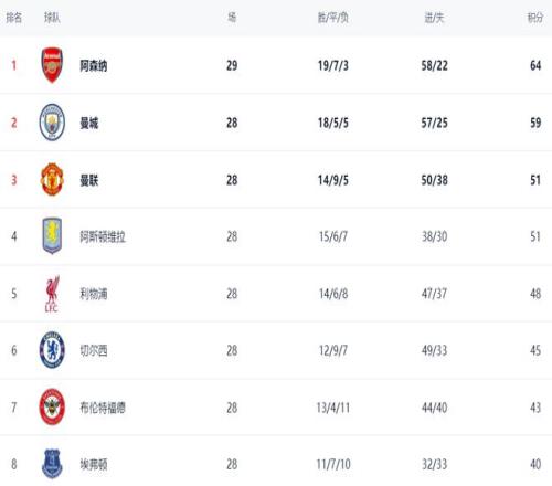 在積分榜上,阿森納以64分領(lǐng)跑,戰(zhàn)績是19勝7平3負。曼城拿到59分,排名第2。阿森納比曼城多了5分,但比曼城多踢1場。曼聯(lián)贏球之后升到了第3名,總積分達到51分。阿斯頓維拉也是51分,但凈勝球遠不如曼聯(lián),排名掉到第4。利物浦以48分排名第5。切爾西輸球后,積分依然是45分,排名第6。布倫特福德43分,排名第7。