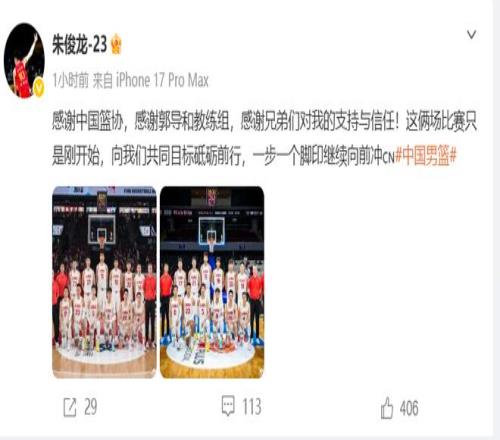 賽后,朱俊龍還在社媒發(fā)文,表示:感謝中國籃協(xié),感謝郭導和教練組,感謝兄弟們對我的支持與信任!這兩場比賽只是剛開始,向我們共同目標砥礪前行,一步一個腳印繼續(xù)向前沖。