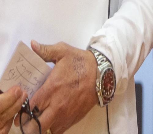 記者拍到穆帥手上寫著字。記錄報報道,穆帥手上寫著單詞的縮寫:“Repu”、“Disc”、“Preco”、“Igno”,即譴責、歧視、偏見和無知。