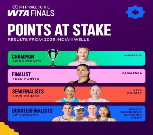 WTA1000印第安維爾斯站保分情況:鄭欽文8強(qiáng)215分,薩巴亞軍615分