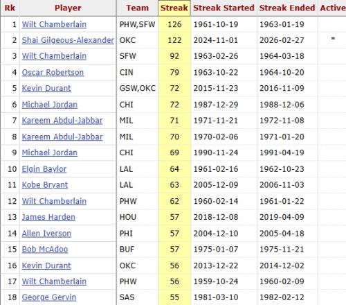 這是亞歷山大連續(xù)123場至少拿到20分,距離張伯倫在1961-63賽季的NBA歷史紀(jì)錄僅差3場。