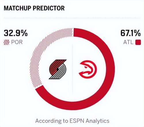 老鷹近期連勝的對手為籃網(wǎng)、奇才,整體實力偏弱,連勝含金量相對有限;開拓者狀態(tài)同樣起伏不定,兩隊近期表現(xiàn)與競技狀態(tài)差距不大。綜合來看,老鷹略占優(yōu)勢,且此役是開拓者連續(xù)客場第三戰(zhàn),還將面臨背靠背作戰(zhàn),體能消耗較大!ESPN預測本場比賽,老鷹勝率67.1%,開拓者勝率32.9%。