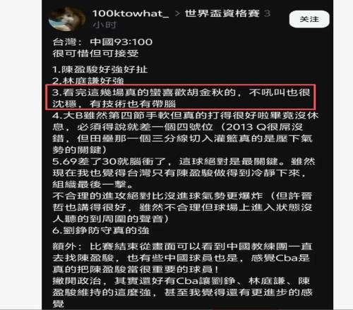 沒錯(cuò),讓臺(tái)北球迷印象最深的就是國(guó)家隊(duì)的胡金秋,有臺(tái)北球迷表示最喜歡胡金秋,他們說(shuō):“.看完這幾場(chǎng)真的蠻喜歡胡金秋的,不吼叫也很沉穩(wěn),有技術(shù)也有帶腦。”實(shí)際就是贊胡金秋技術(shù)好,人品好,球商好。