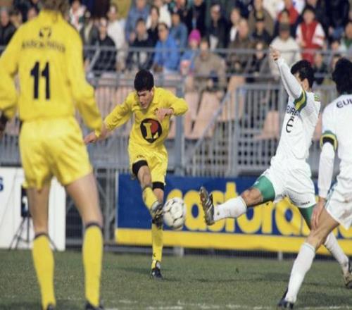 齊達內(nèi):這是在戛納,那時候我還有頭發(fā)(笑)。我在法甲主場對陣南特的第一粒進球(1991年2月10日,2-1)。我在法甲的第一場比賽也是對南特,不過是在客場拉博若瓦球場(1989年5月20日,1-1)。我在比賽還剩十分鐘時替補登場。那時候每隊只有兩名替補。我和博羅-普里莫拉茨一起坐在替補席上。是讓-費爾南德斯派我上場的。