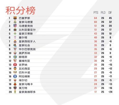 北京時(shí)間3月3日凌晨,西甲第26輪最后一場(chǎng)比賽落下帷幕,聯(lián)賽第二的皇家馬德里客場(chǎng)爆冷不敵赫塔費(fèi),遭遇聯(lián)賽兩連敗,由于此前先賽的巴塞羅那4比1大勝黃潛,巴薩的領(lǐng)先優(yōu)勢(shì)擴(kuò)大至4分;馬德里競(jìng)技客場(chǎng)1比0擊敗聯(lián)賽倒數(shù)第一皇家奧維耶多,積分追平比利亞雷亞爾,并憑借凈勝球優(yōu)勢(shì)反超來(lái)到第三位,黃潛落至第四位;皇家貝蒂斯2比2戰(zhàn)平塞維利亞后,積43分排名第五,塞爾塔客勝赫羅納后積40分排名第六。