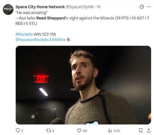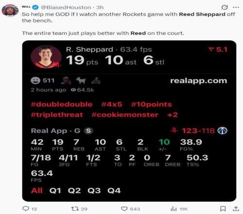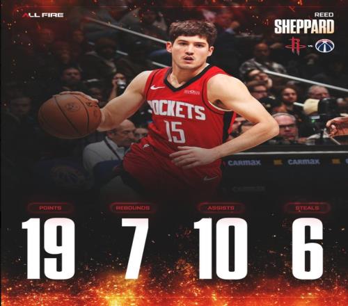 此役后謝潑德最近四場比賽,場均35.2分鐘,拿到20.3分5.3助攻4.5籃板2.5搶斷1.3蓋帽,三分命中率44.4%,他本賽季先發(fā)的9場比賽火箭7勝2負。