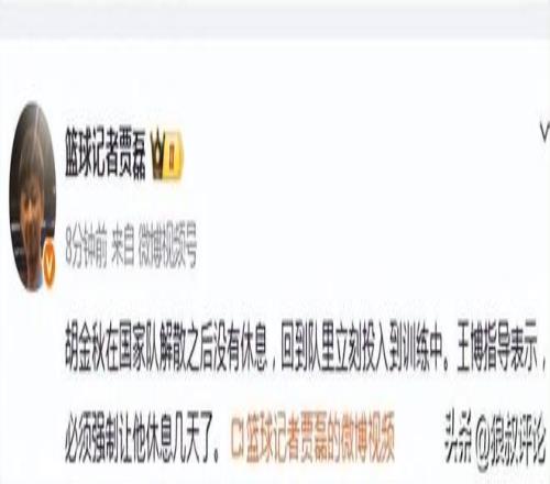 北京時間3月3日,根據(jù)籃球記者“賈磊”發(fā)文:胡金秋在國家隊解散之后沒有休息,回到隊里立刻投入到訓練中。王博指導表示,必須強制讓他休息幾天了。