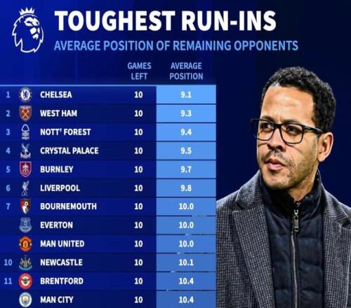 德轉(zhuǎn)統(tǒng)計本賽季英超最后10輪各隊對手平均排名: