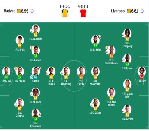 狼隊(duì)首發(fā):1-若澤·薩、2-多赫蒂(60’14-阿洛科達(dá)爾)、4-圣地亞哥·布埃諾、6-沃爾費(fèi)(79’3-烏戈·布埃諾)、38-查丘瓦、37-克雷伊奇、47-安赫爾·戈麥斯(60’15-耶森·莫斯克拉)、7-特林達(dá)德、8-若昂·戈麥斯、36-馬特烏斯·馬內(nèi)(70’21-羅德里戈·戈麥斯)、9-阿姆斯特朗(60’27-貝萊加德)。
