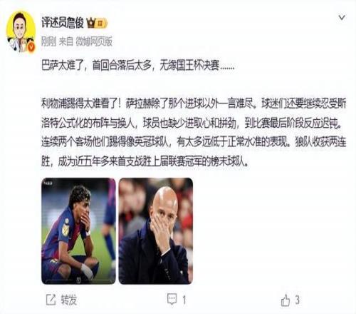 詹俊在賽后點(diǎn)評(píng)中直言不諱:“利物浦踢得太難看了!薩拉赫除了那個(gè)進(jìn)球以外一言難盡。球迷們還要繼續(xù)忍受斯洛特公式化的布陣與換人,球員也缺少進(jìn)取心和拼勁,到比賽最后階段反應(yīng)遲鈍?!?/p>