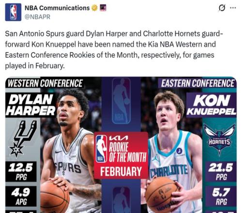 值得一提的是,在本場比賽開始前,克努佩爾才當選2月份月最佳新秀,2月份他場均可以拿下21.5分5.7板,三分命中率48.5%。