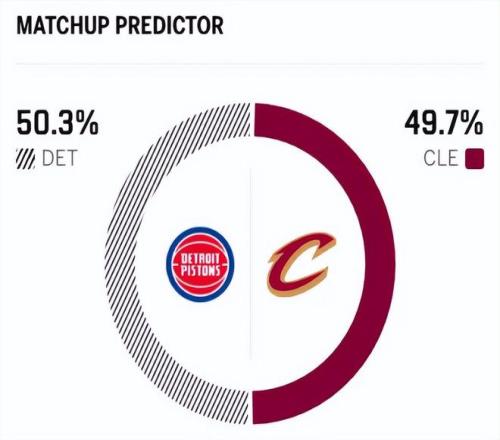 賽前,美媒ESPN對本場比賽進行了預(yù)測,活塞勝率為50.3% ,騎士勝率則為49.7% ,算是平分秋色了。