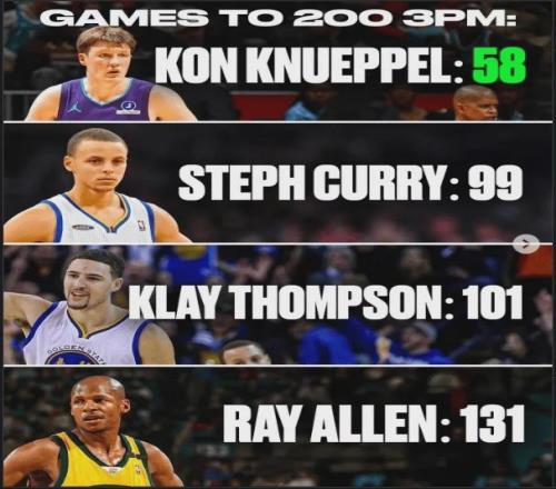 細致到個人數(shù)據(jù)方面,庫里在新秀賽季立刻獲得主力首發(fā)位置,場均出場36分鐘,克努佩爾同樣獲得首發(fā)位置,目前場均出場32分鐘,在出場時間方面落后四分鐘,但在場均三分出手方面,克努佩爾占了大優(yōu)勢,庫里新秀賽季場均三分僅出手4.8次,在當時的籃球環(huán)境下,沒有教練會允許一個新秀球員大量三分出手,一個球員如果選擇直接持球三分出手甚至?xí)⒖淘獾浇叹毻闯?,而克努佩爾完全沒有這種限制,他在一支重建隊,現(xiàn)在教練甚至?xí)膭钋騿T在三分線外有機會就投,所以克努佩爾的場均三分出手次數(shù)高達8次,在全聯(lián)盟排名第12,他之所以能打破新秀三分命中記錄,是天時地利人和的完美結(jié)合.
