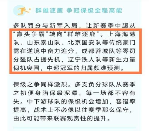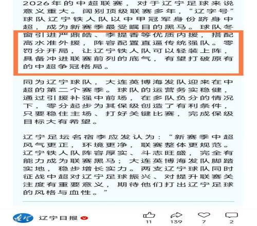 第二個,這篇文章還提到了一個細節(jié),那就是介紹今年中超的爭冠格局是群雄逐鹿,專門提到了5支球隊名字,分別是海港、泰山、國安、成都蓉城和遼寧鐵人,再次認可了遼寧鐵人的爭冠可能性。