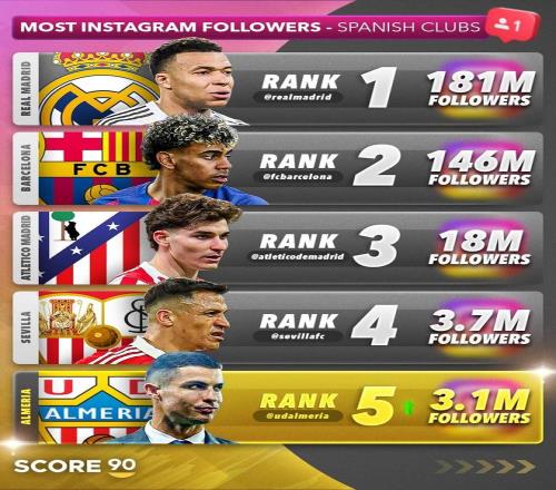 在C羅完成對(duì)阿爾梅里亞俱樂(lè)部的部分股權(quán)收購(gòu)后,阿爾梅里亞俱樂(lè)部的官方社交媒體賬號(hào)粉絲數(shù)量飆升,截至目前,阿爾梅里亞的社媒賬號(hào)粉絲量達(dá)到了310萬(wàn),成為粉絲數(shù)量第五多的西班牙足球俱樂(lè)部。